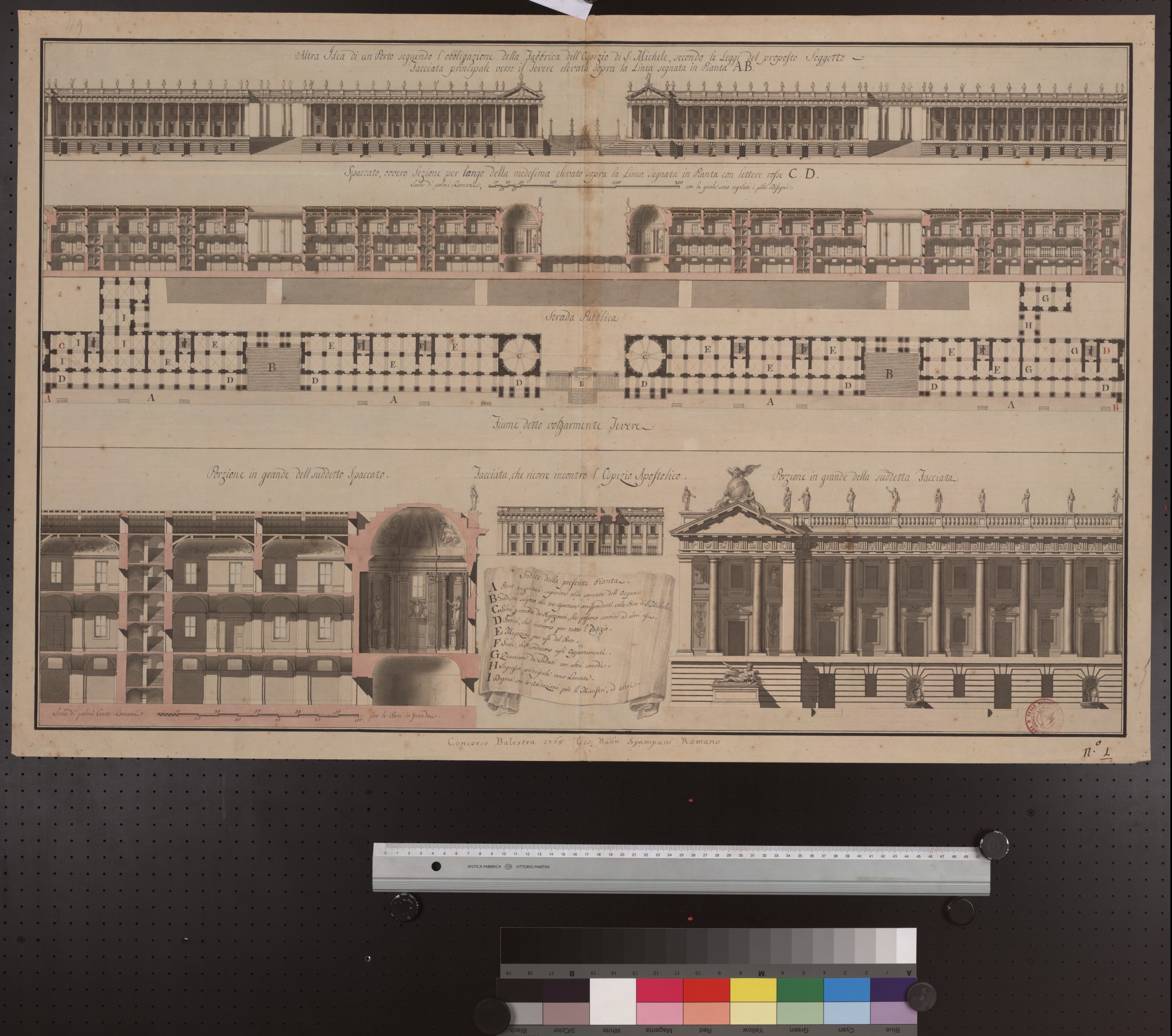 | Technik | Disegno preparatorio: matita, riga, compasso, grafite, grigio Disegno: penna, riga, compasso, china, nero Acquarellatura: pennello, inchiostro, scala di grigi, rosa |