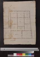 | Technik | Disegno preparatorio: matita, riga, compasso, grafite, grigio, assi di simmetria, linee di fuga Disegno: penna, riga, compasso, inchiostro, marrone Acquarellatura: pennello, inchiostro, marrone, viola |