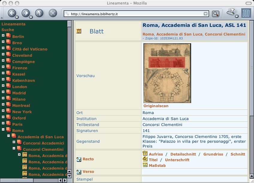 Durch Überfahren des Links "Aufriss" in der Liste der Zeichnungen auf dem Recto wird in der Voransicht der entsprechende Bereich zur leichteren Orientierung rot markiert.