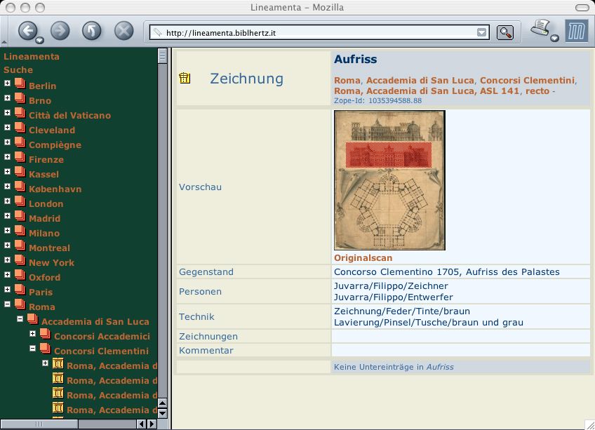 Ein Klick auf den Link "Aufriss" führt zum entsprechenden Datenbank-Eintrag. Neben weiteren Informationen speziell zu dieser Zeichnung erreicht man durch einen Klick auf "Originalscan" hier sofort den entsprechenden Bildausschnitt aus dem Scan in hoher Auflösung. (Diese Funktion ist z.Z. aus urheber- und bildrechtlichen Gründen nur bei einigen Datenbankeinträgen für alle Benutzer aktiviert.)
